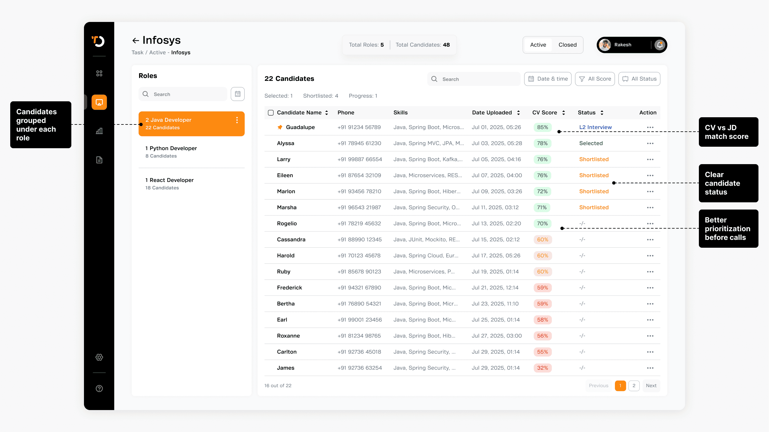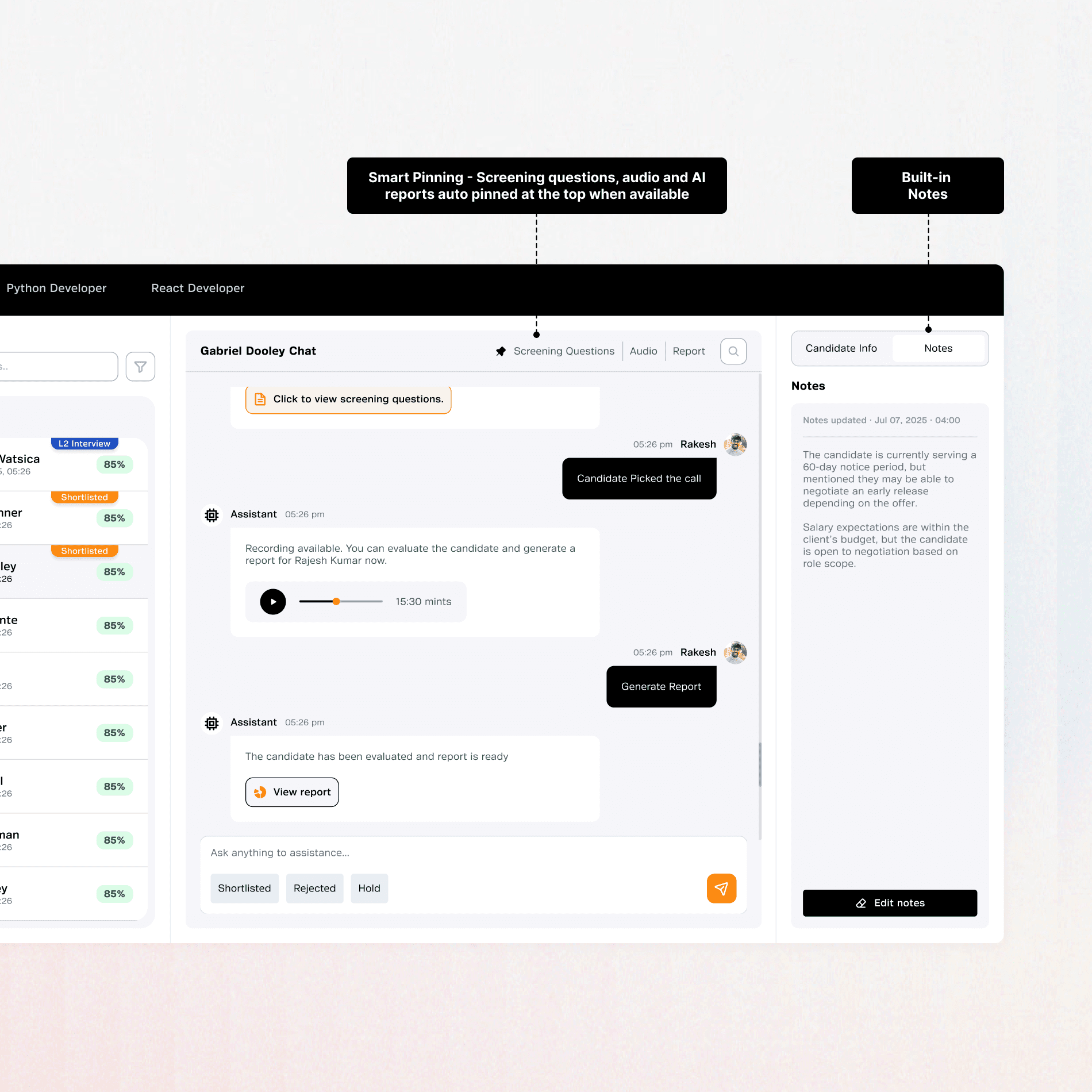 Updating candidate status was slow. Recruiters had to open the profile and come back each time, which felt tiring during back-to-back calls. Switching between candidates also took too many steps.