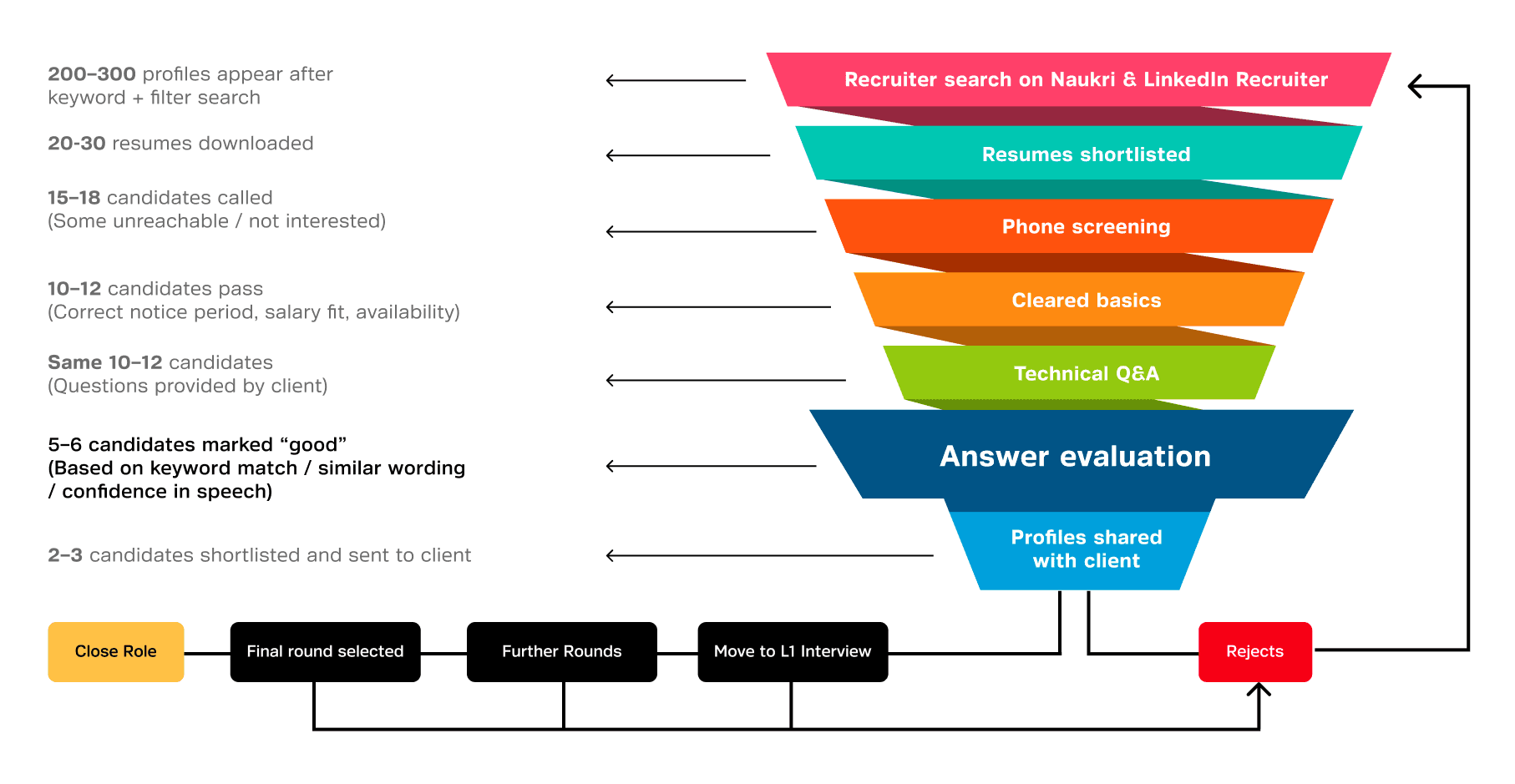 Candidates who sound confident or give long explanations are often marked as good—even when recruiters aren’t sure the answer is correct. These shortlisted candidates are then shared with clients. When clients ask for proof of quality, recruiters submit their call notes. If candidates fail the client’s L1 interview, recruiters must quickly find replacements, repeating the same rushed process again.