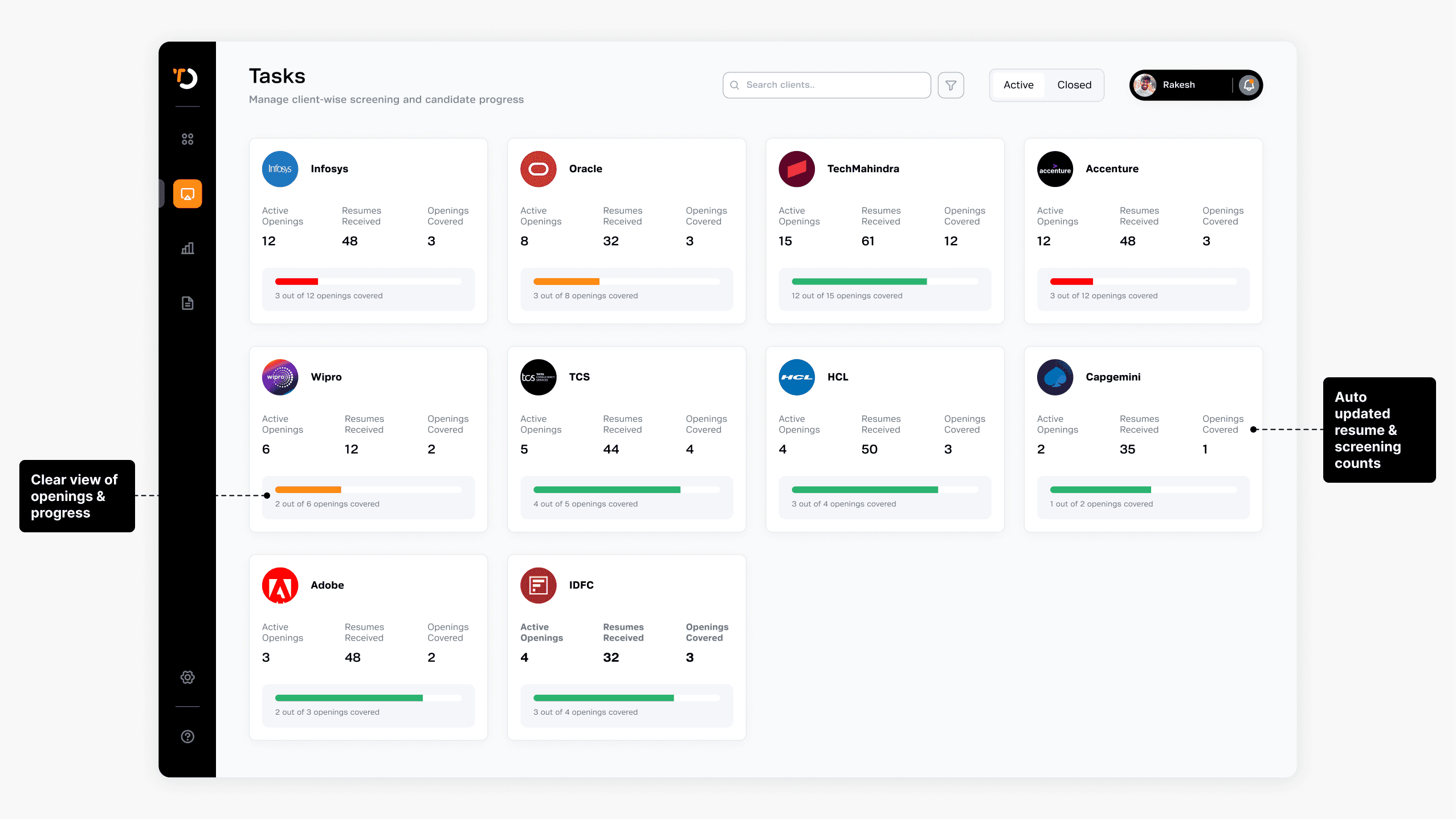 Recruiters managed client work across emails, Excel, ATS, and notes, so progress mostly lived in their heads. We introduced the Client Dashboard — a single place with structured client cards and auto-updated counts. Now recruiters can quickly see openings, screened candidates, and overall progress. This improved pipeline visibility helped recruiters stay aligned on role priorities and screening status, enabling more structured coordination before submissions were made to clients.