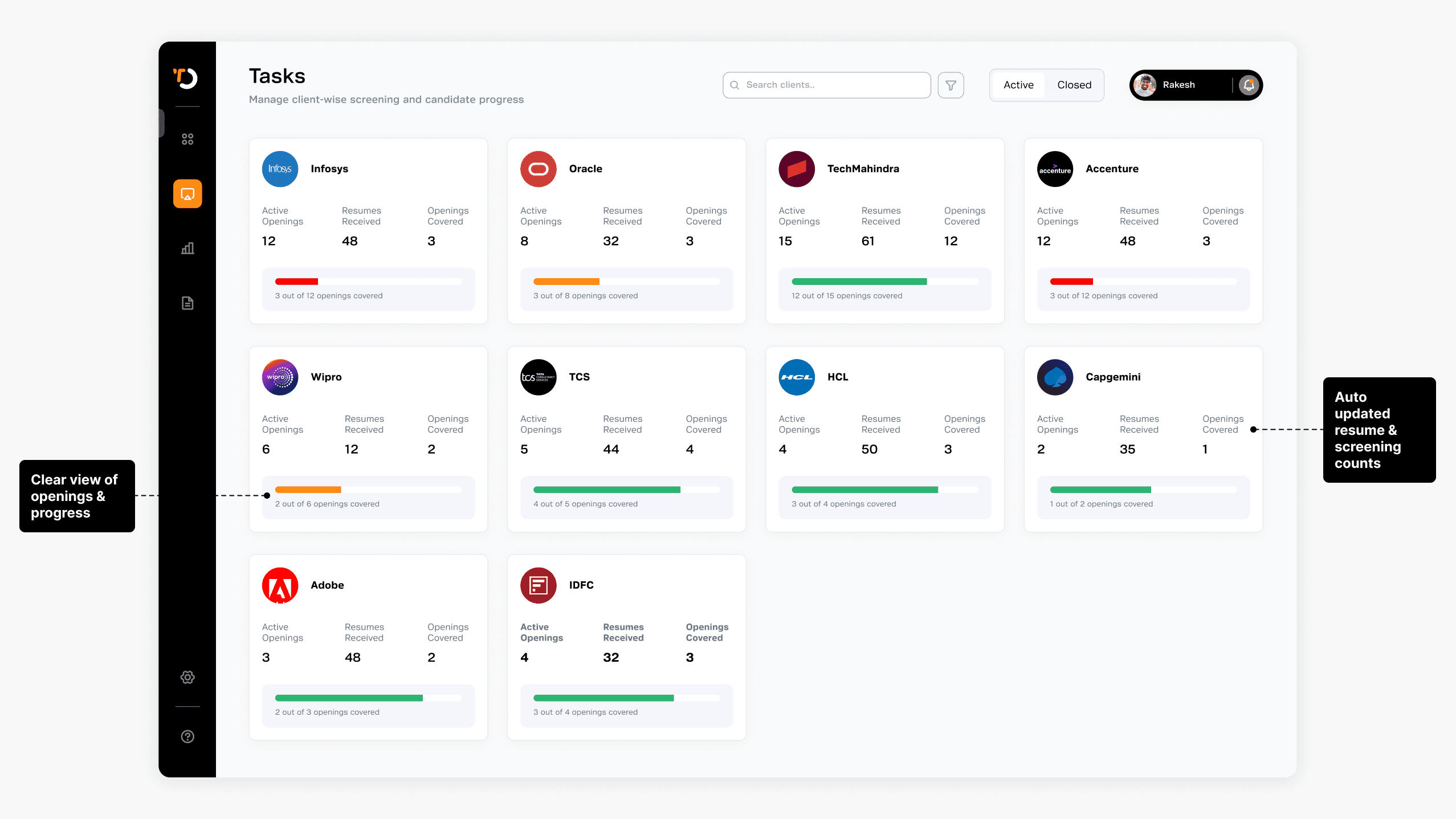 Recruiters managed client work across emails, Excel, ATS, and notes, so progress mostly lived in their heads. We introduced the Client Dashboard — a single place with structured client cards and auto-updated counts. Now recruiters can quickly see openings, screened candidates, and overall progress.